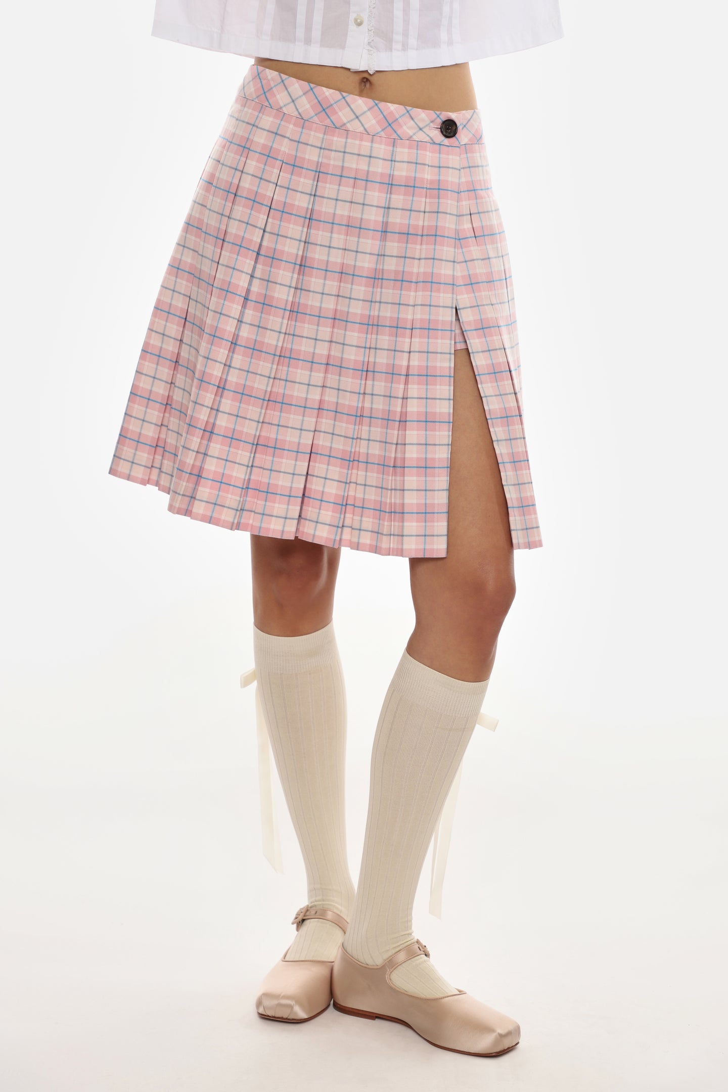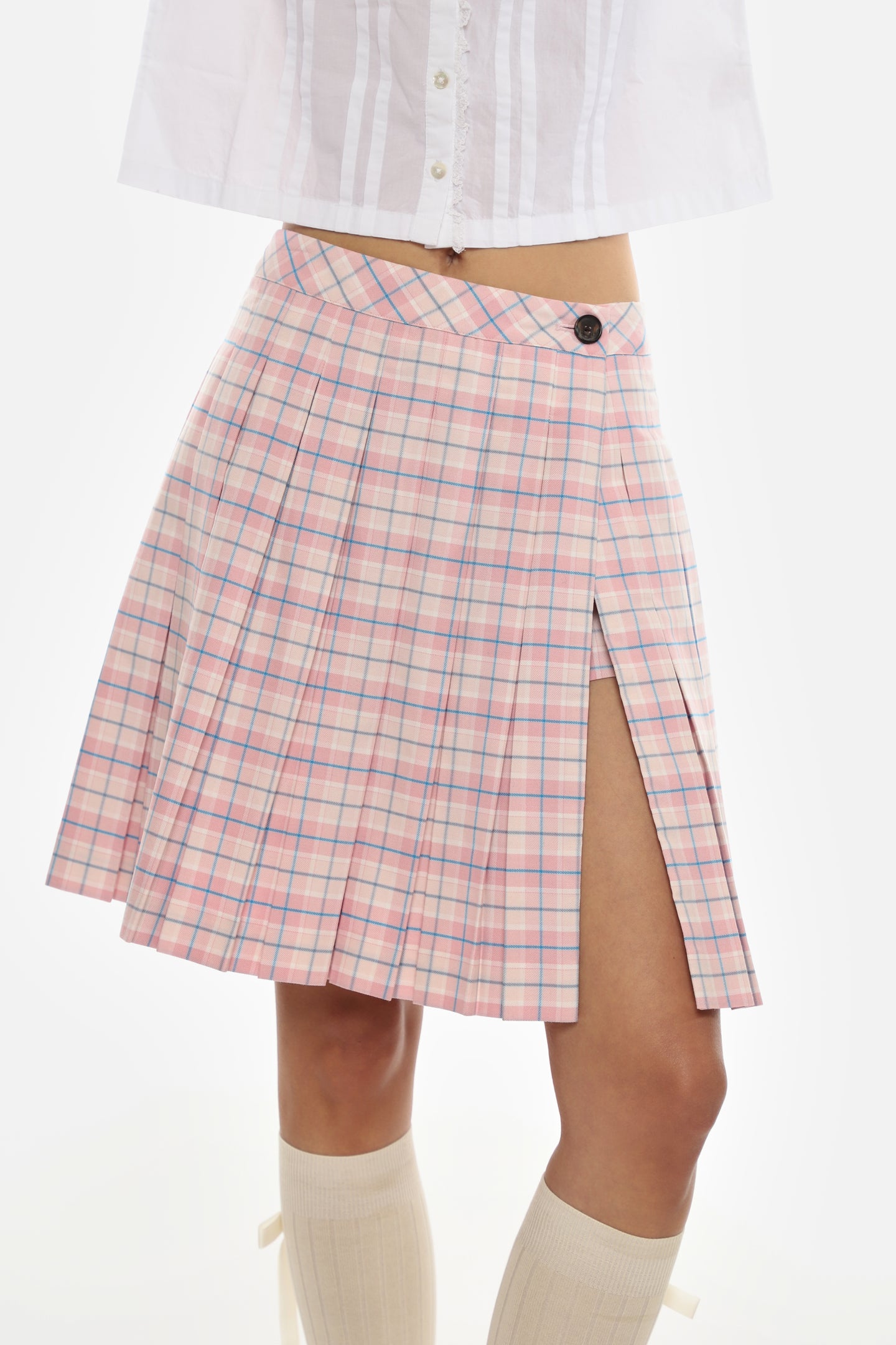Pleated knee length skort in Pink TartanFeatures built in shortsFully linedMade in NYC