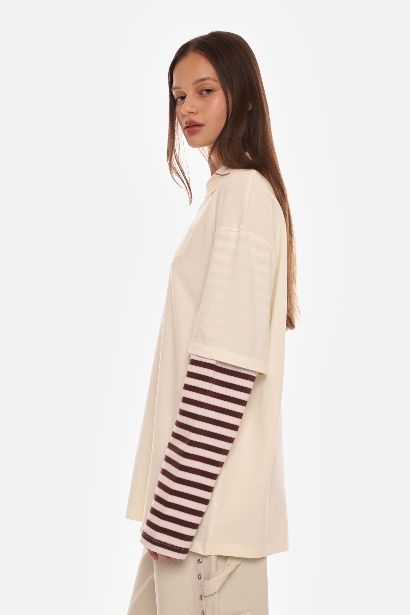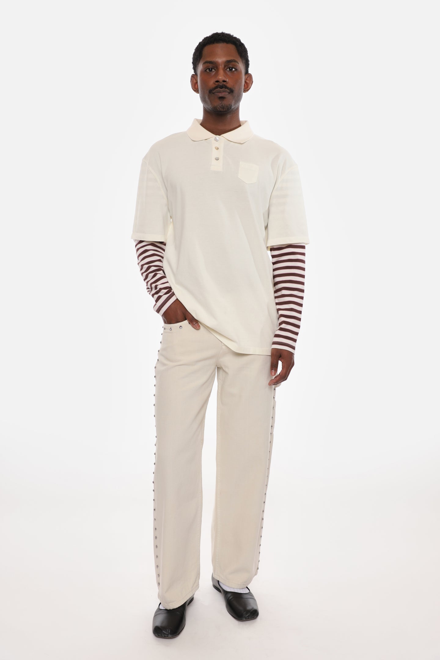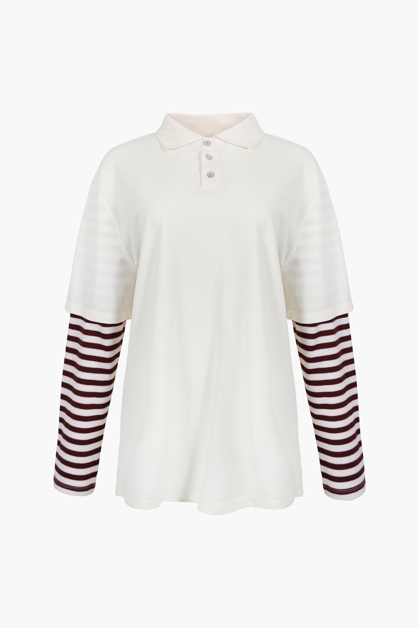 Available for preorder. Ships in late December. Orders with multiple items ship together when this item is availableOversized Polo in CreamContrast striped sleevesLogo detail at chest pocketMother of Pearl buttonsUnisex relaxed fit