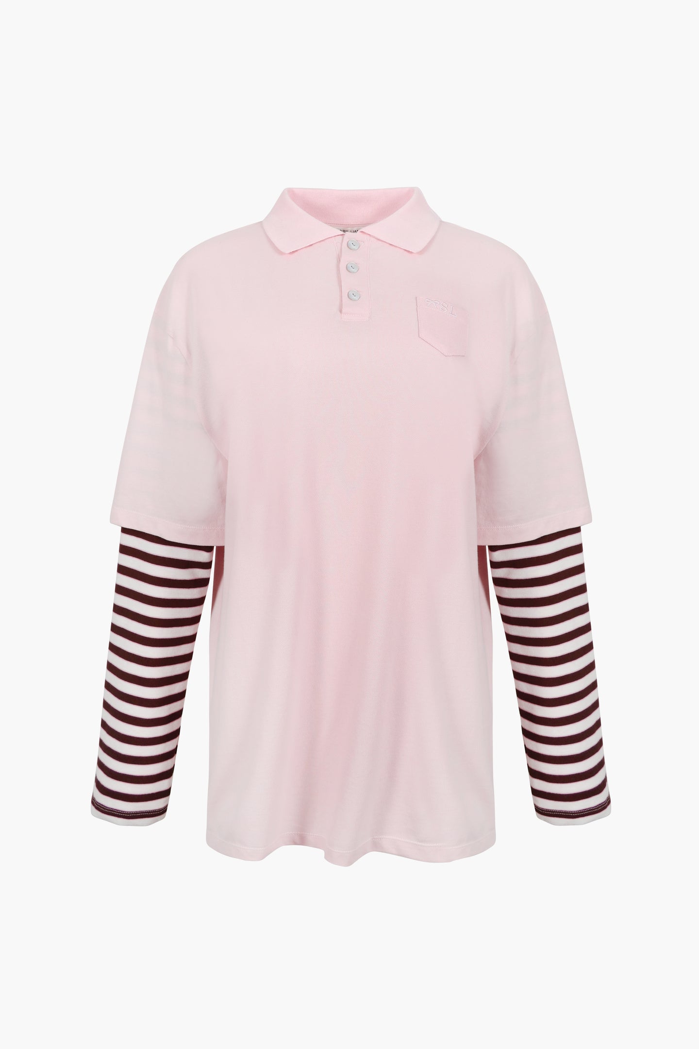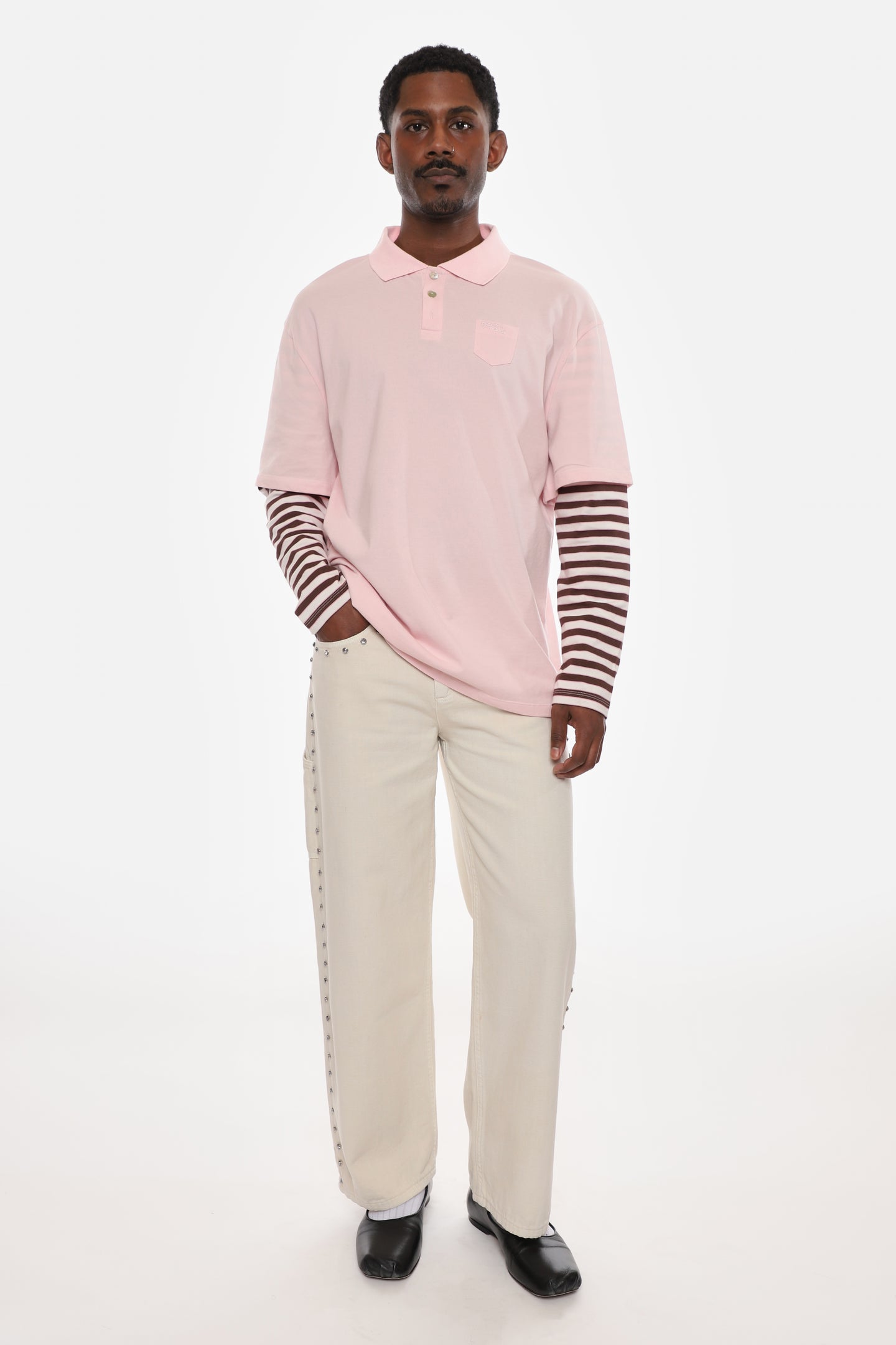Available for preorder. Ships in late December. Orders with multiple items ship together when this item is availableOversized Polo in PinkContrast striped sleevesLogo detail at chest pocketMother of Pearl buttonsUnisex relaxed fit