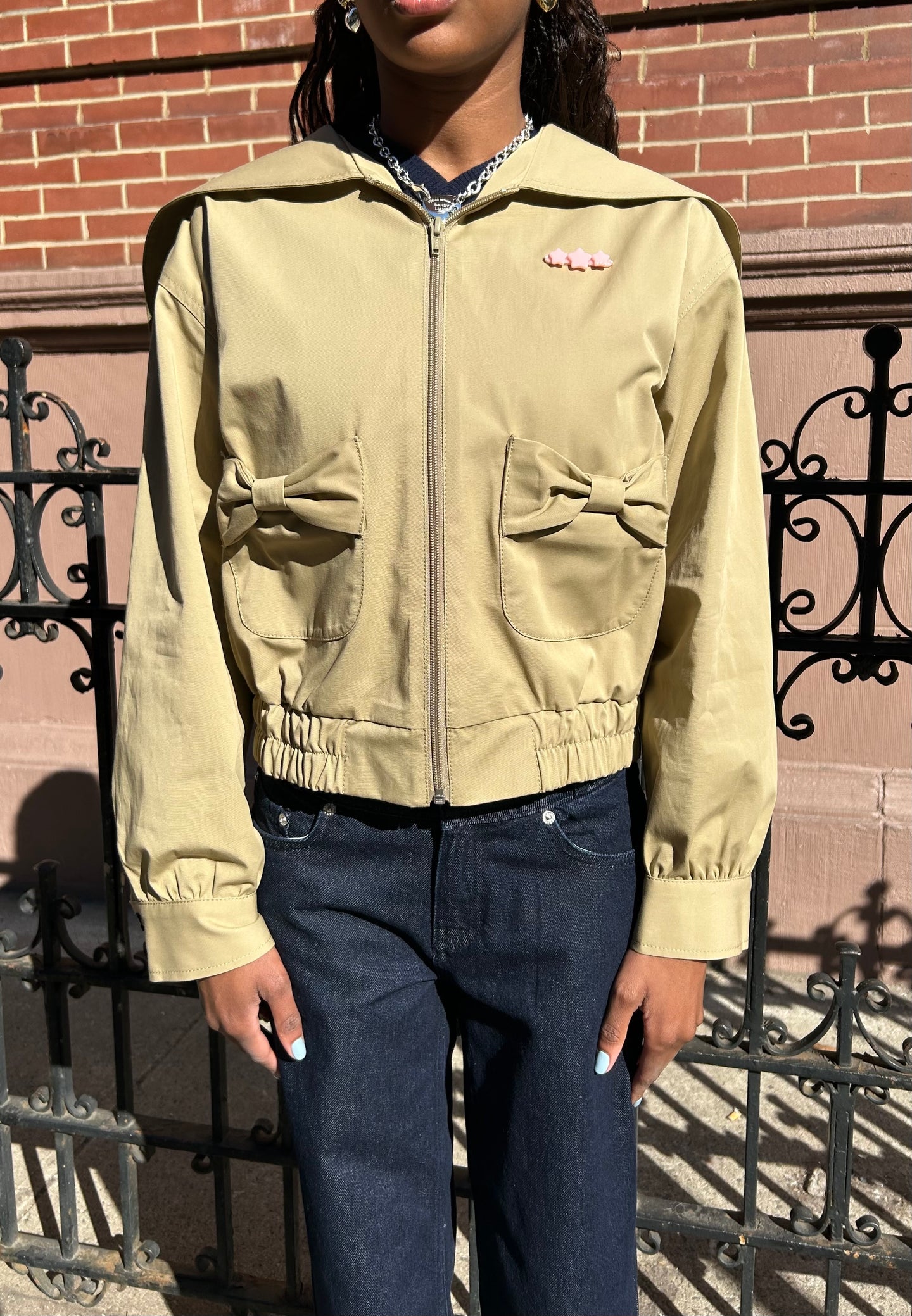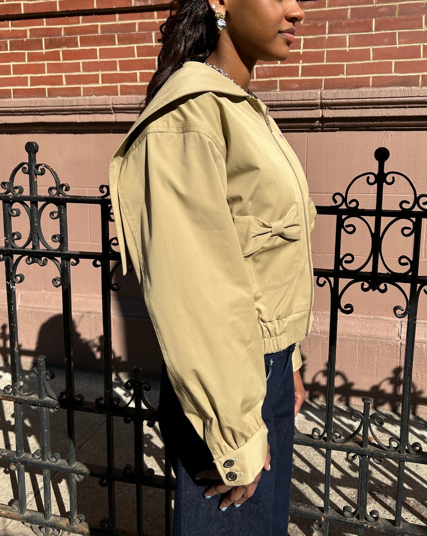 Short relaxed jacket in SandFeatures an oversized sailor collar and bow pockets Barette charm at chest Made in a heavyweight water repellent cotton blend garbardineMade in NYC