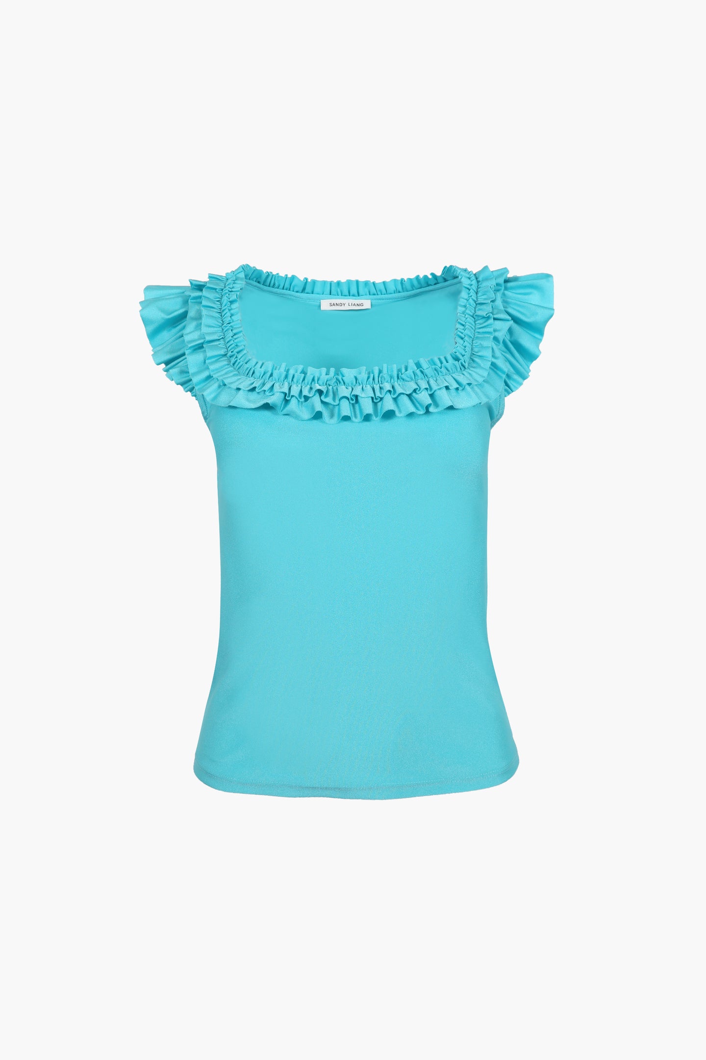 Tank top in Aqua Shimmer SpandexFeatures ruffle details at neckSoft and stretchyMade in NYC