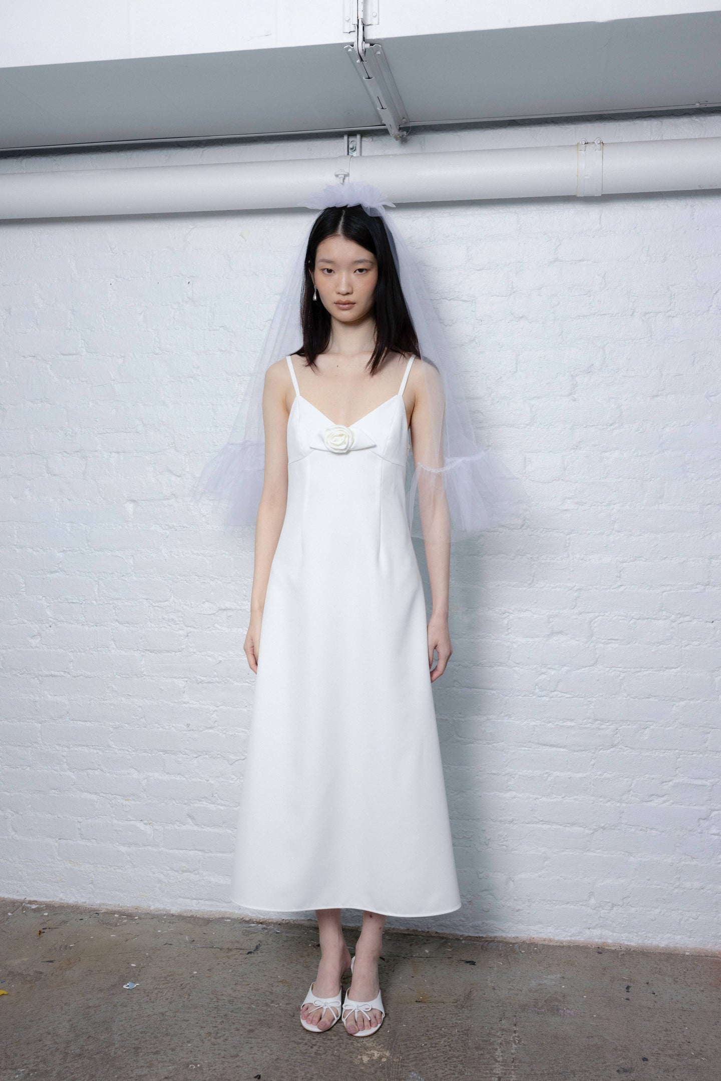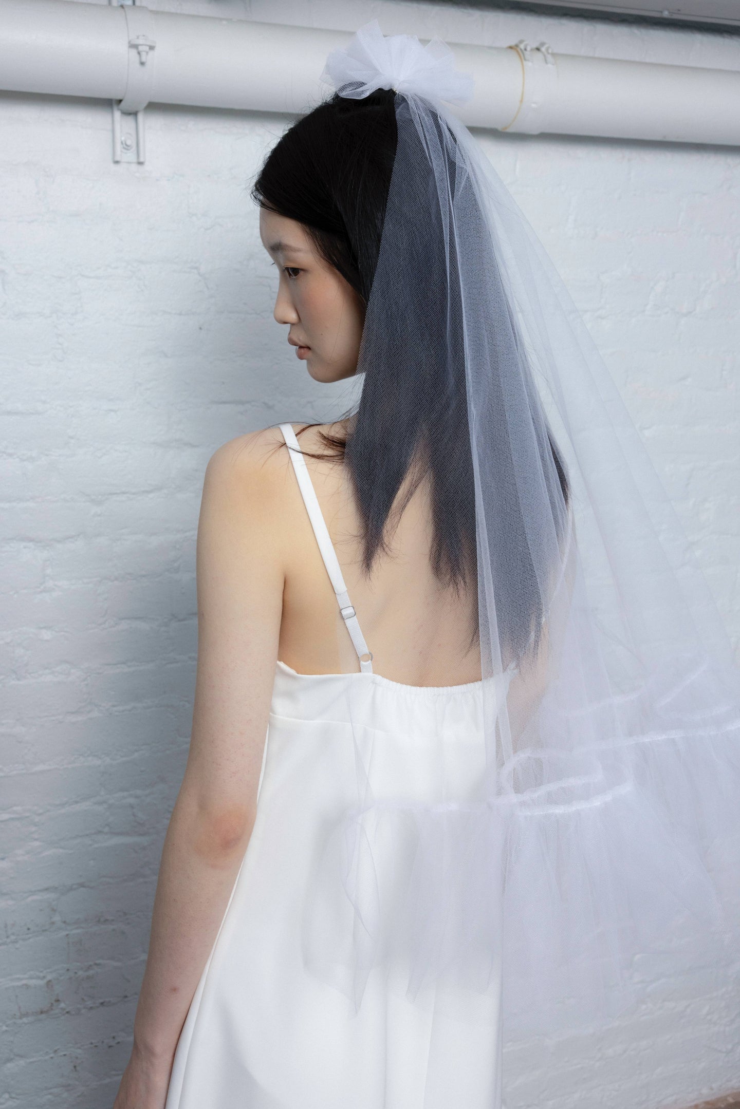 The Kylie is the longest veil in our collection. 30" of white tulle falls below the shoulders when worn. The veil is sewn onto a 5" silver comb. A sweet ruffle adorns the hem and crown. Handmade in NYC.