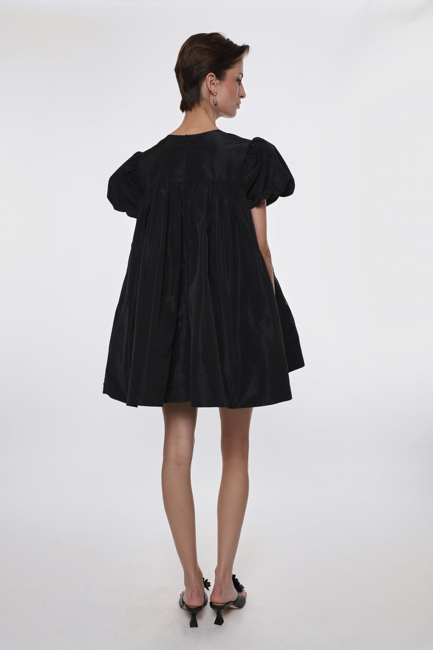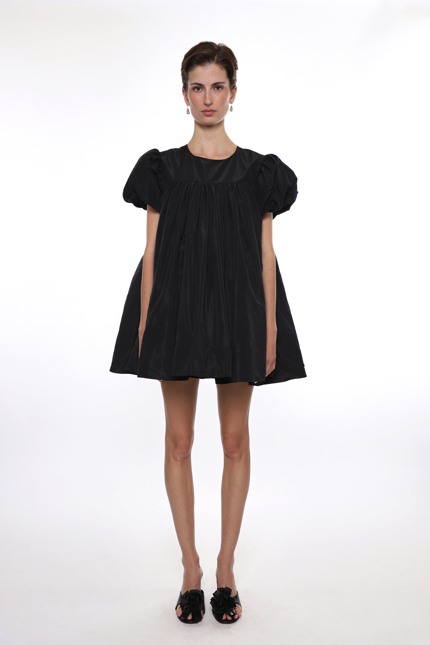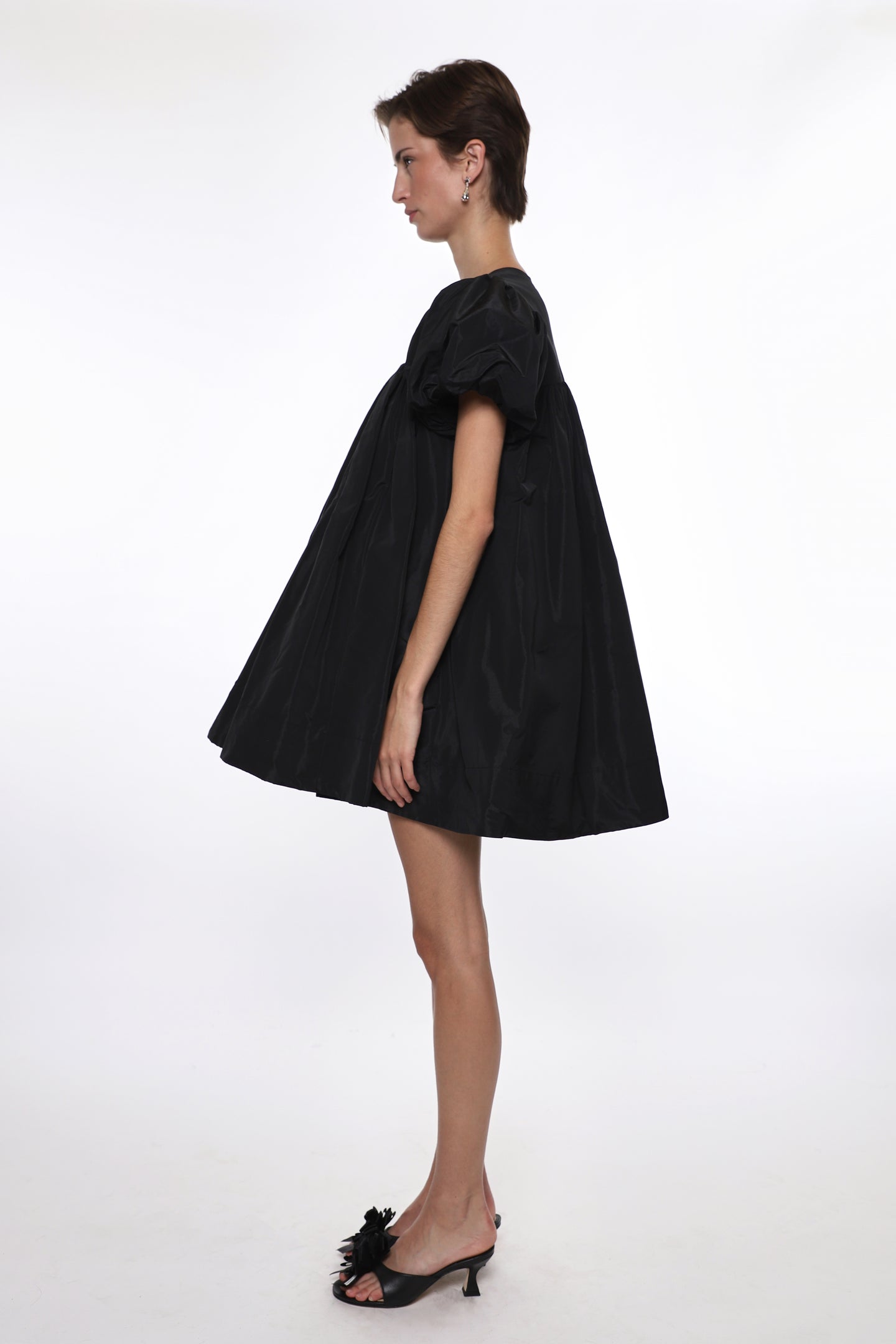 Babydoll dress in Black TaffetaFeatures puff sleeves and a wide skirt sweepTonal zip closure at backFully lined