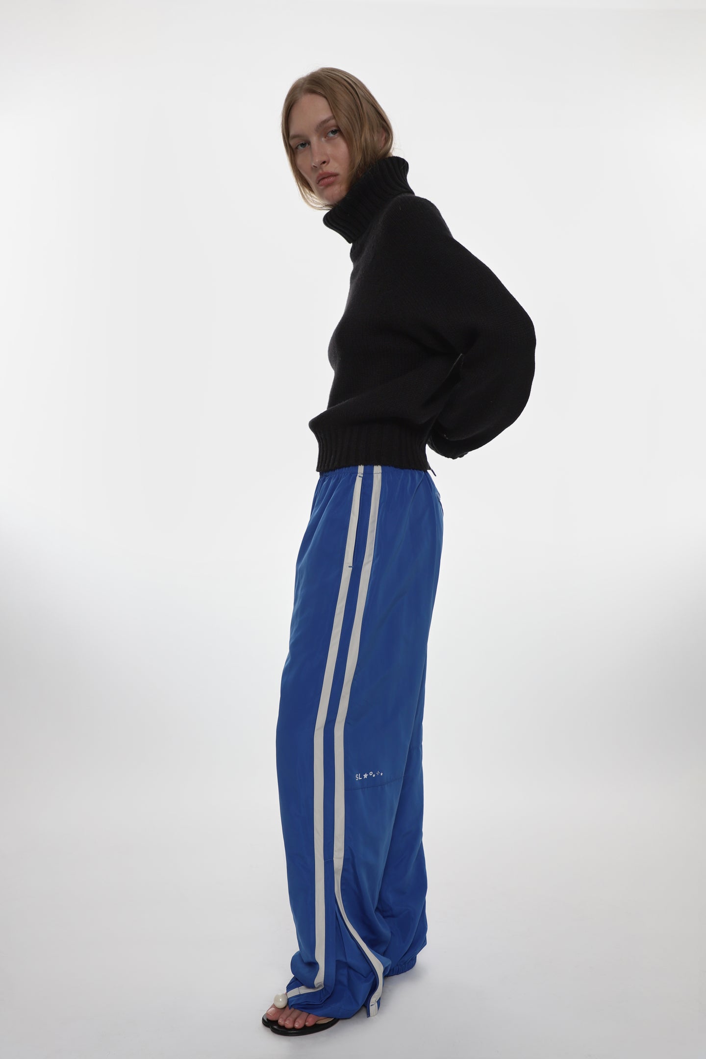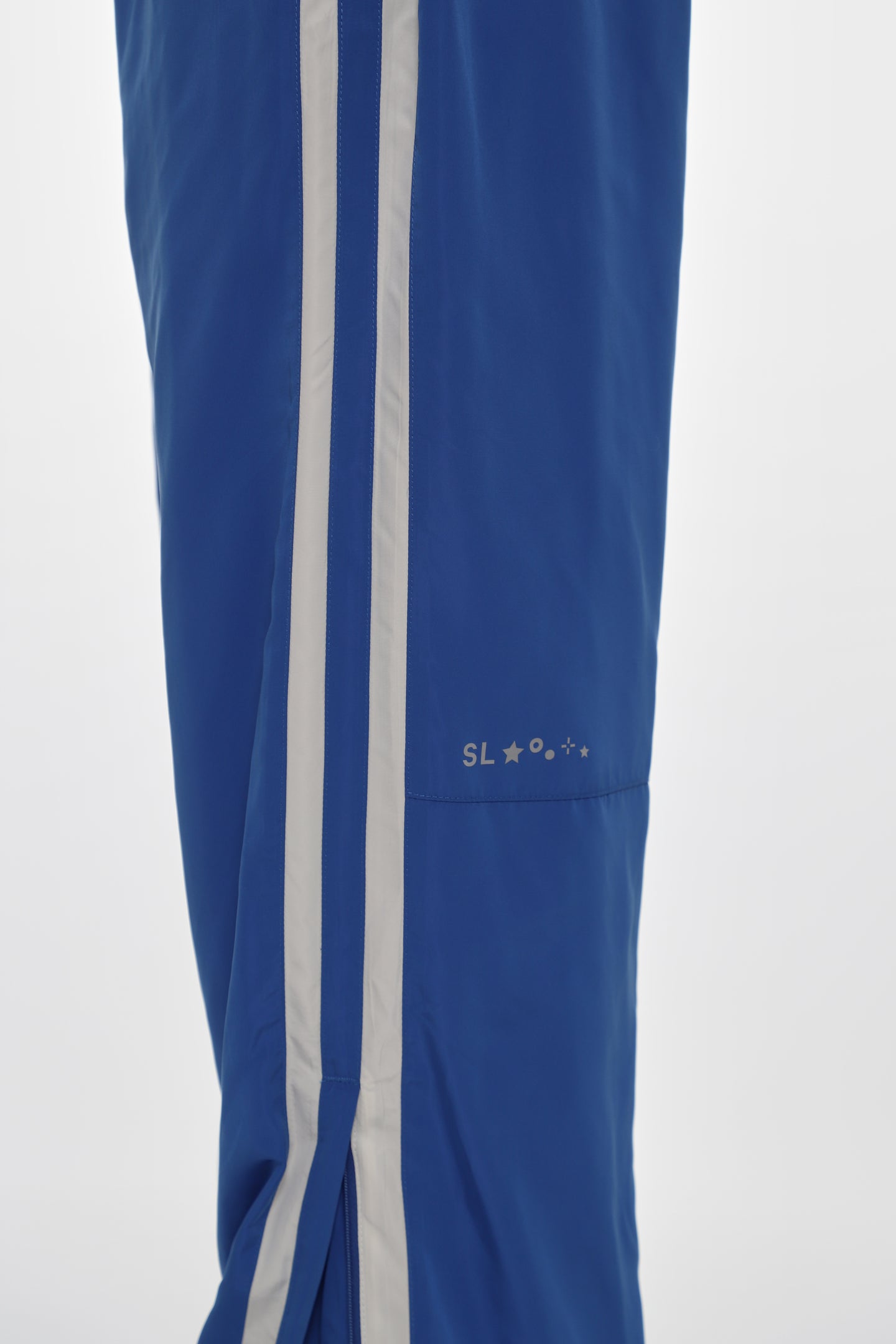 Track pant in Blue TaffetaStripe detail at sideInterior elastic at cuffs with full-leg side zip openingReflective logo at back kneeUnisex fit