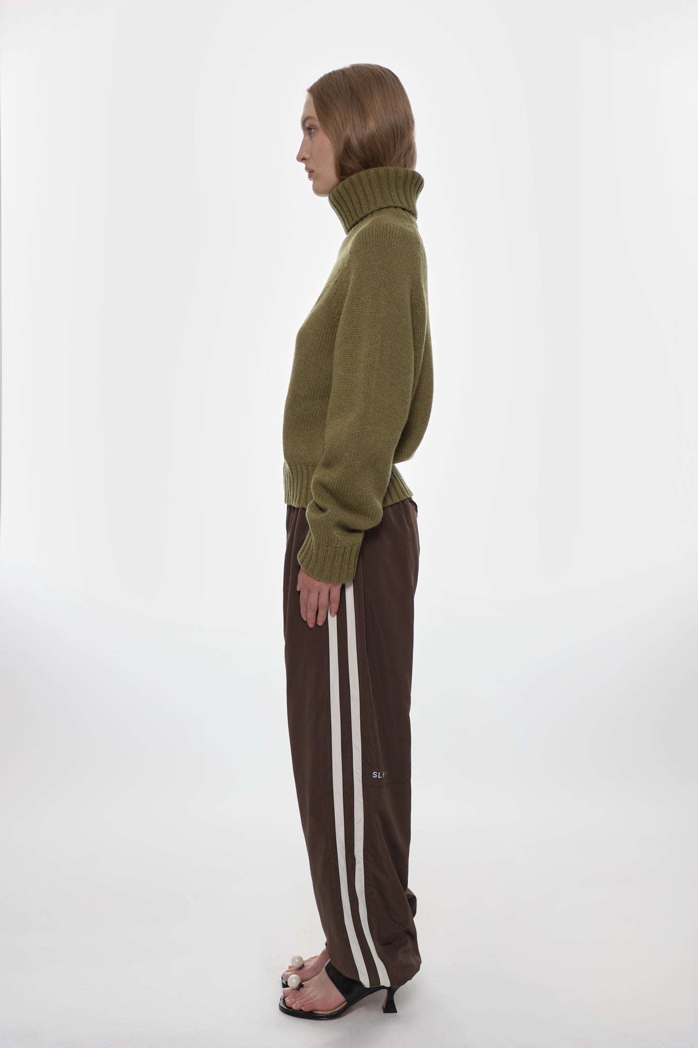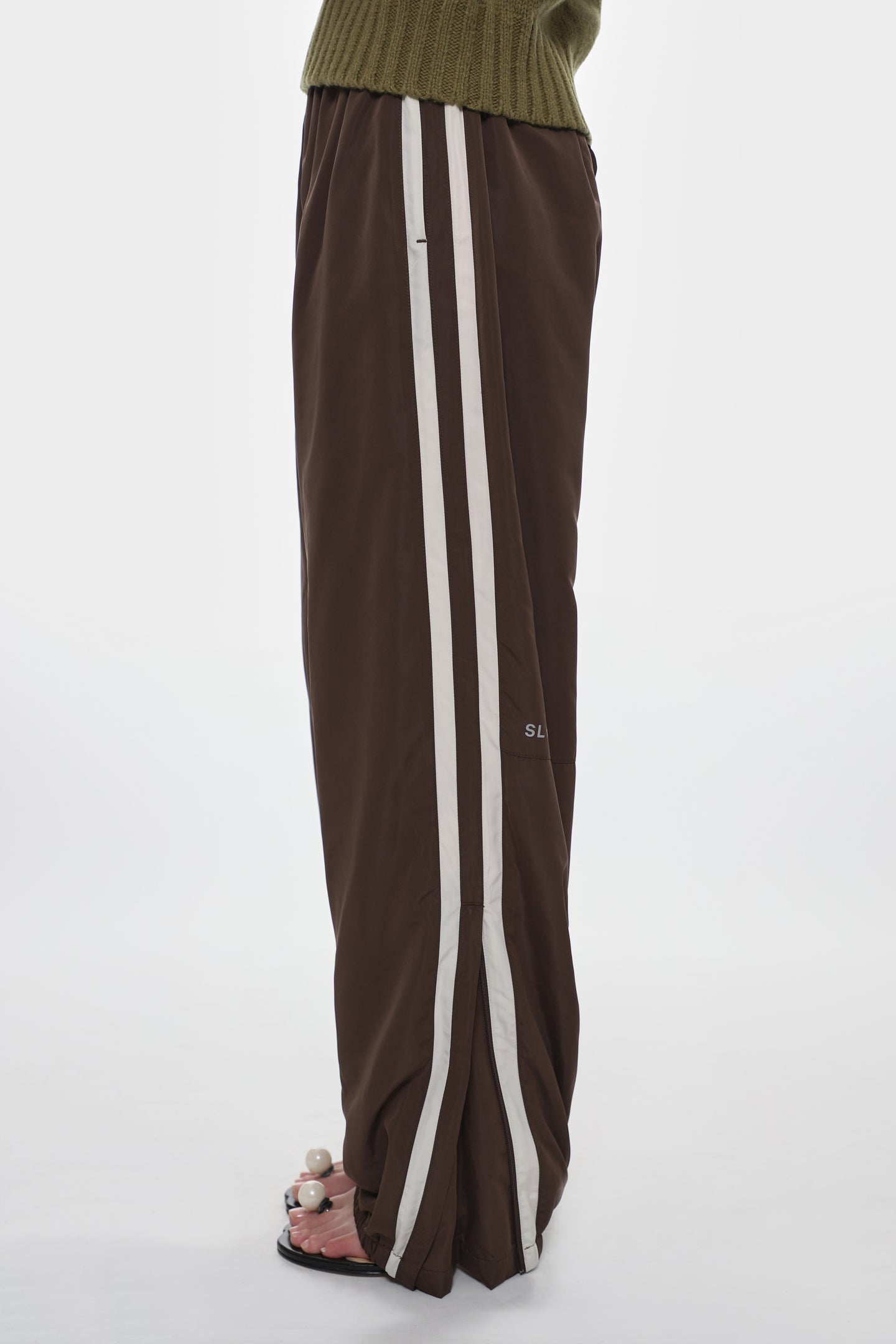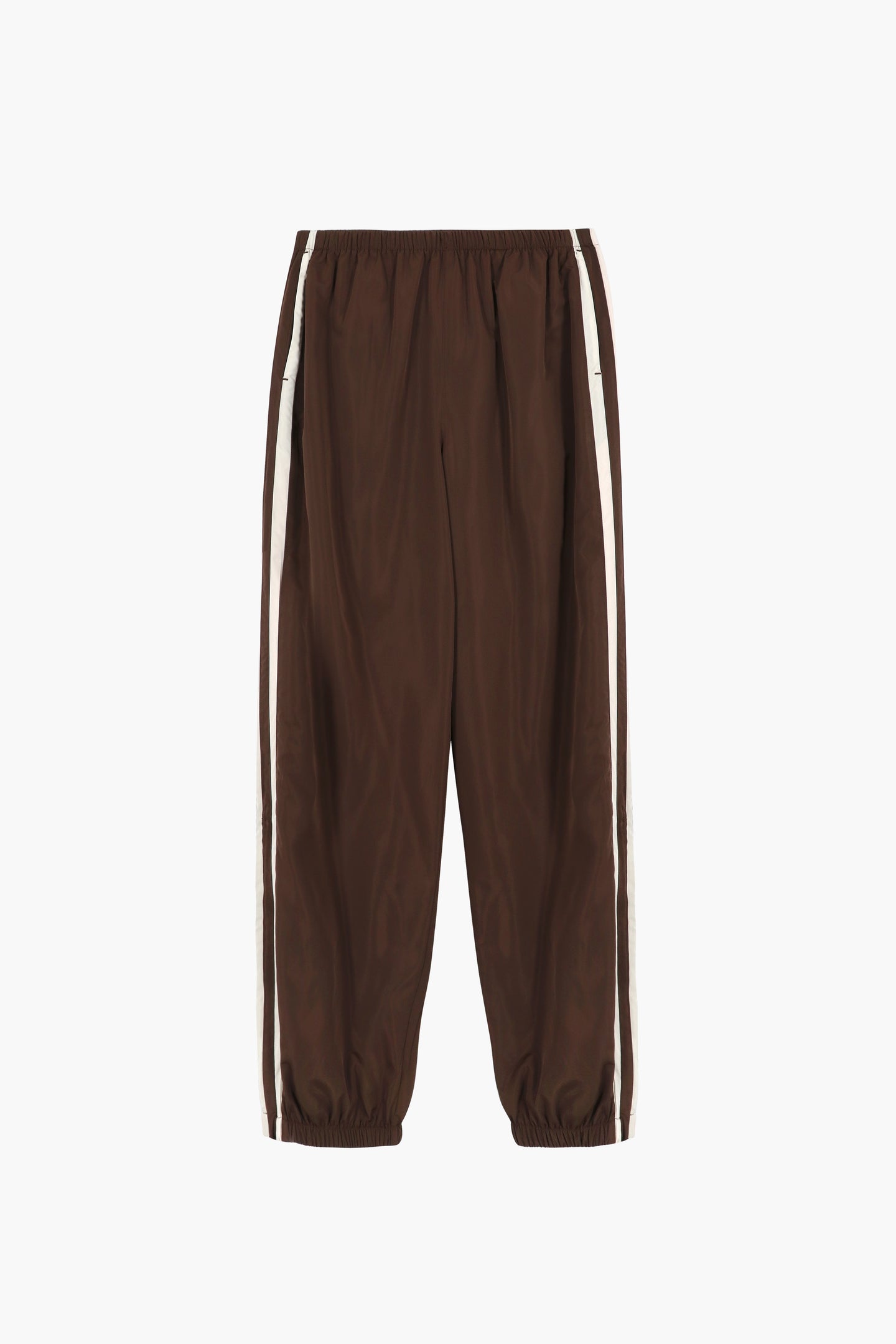 Track pant in Dark Brown TaffetaStripe detail at sideInterior elastic at cuffs with full-leg side zip openingReflective logo at back kneeUnisex fit
