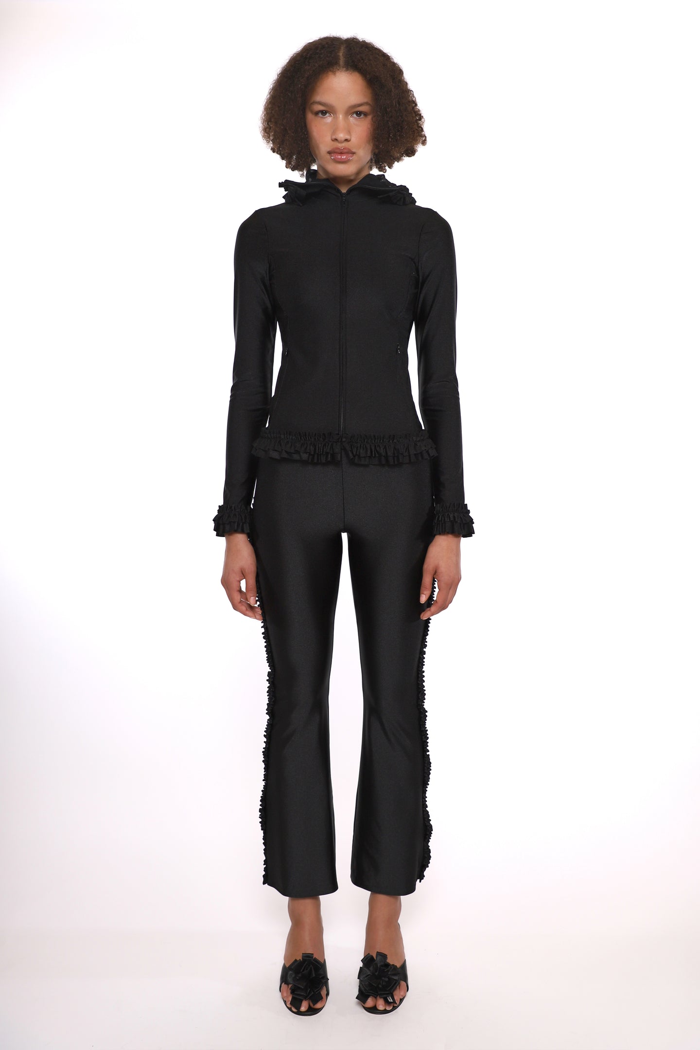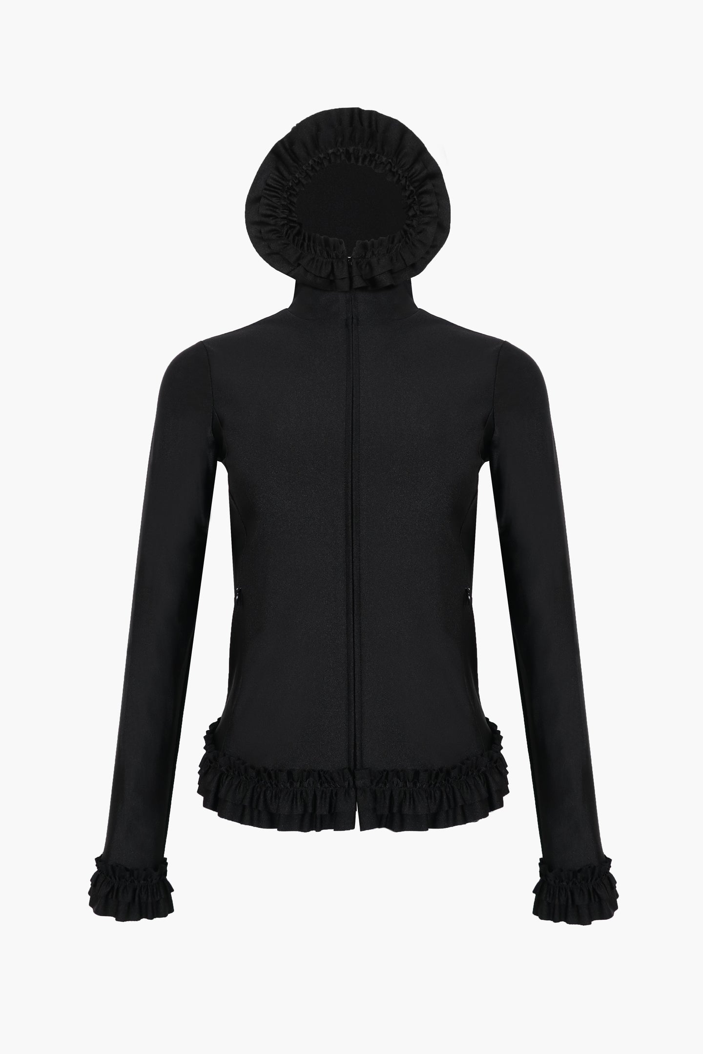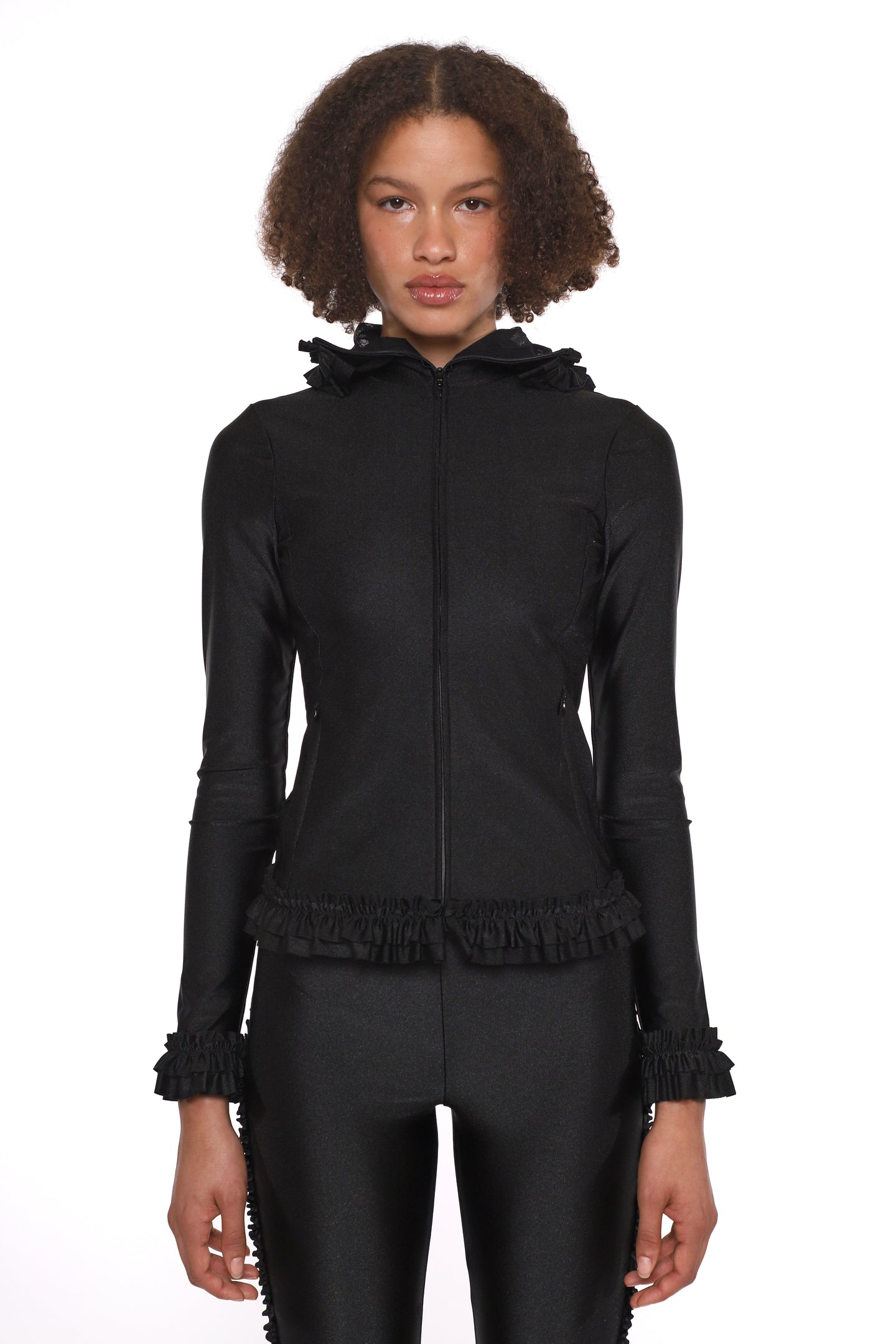 Stretchy fitted hoodie in Black Shimmer SpandexRuffle details throughoutLined in a lightweight meshZip pockets at frontBalaclava hood openingMade in NYC