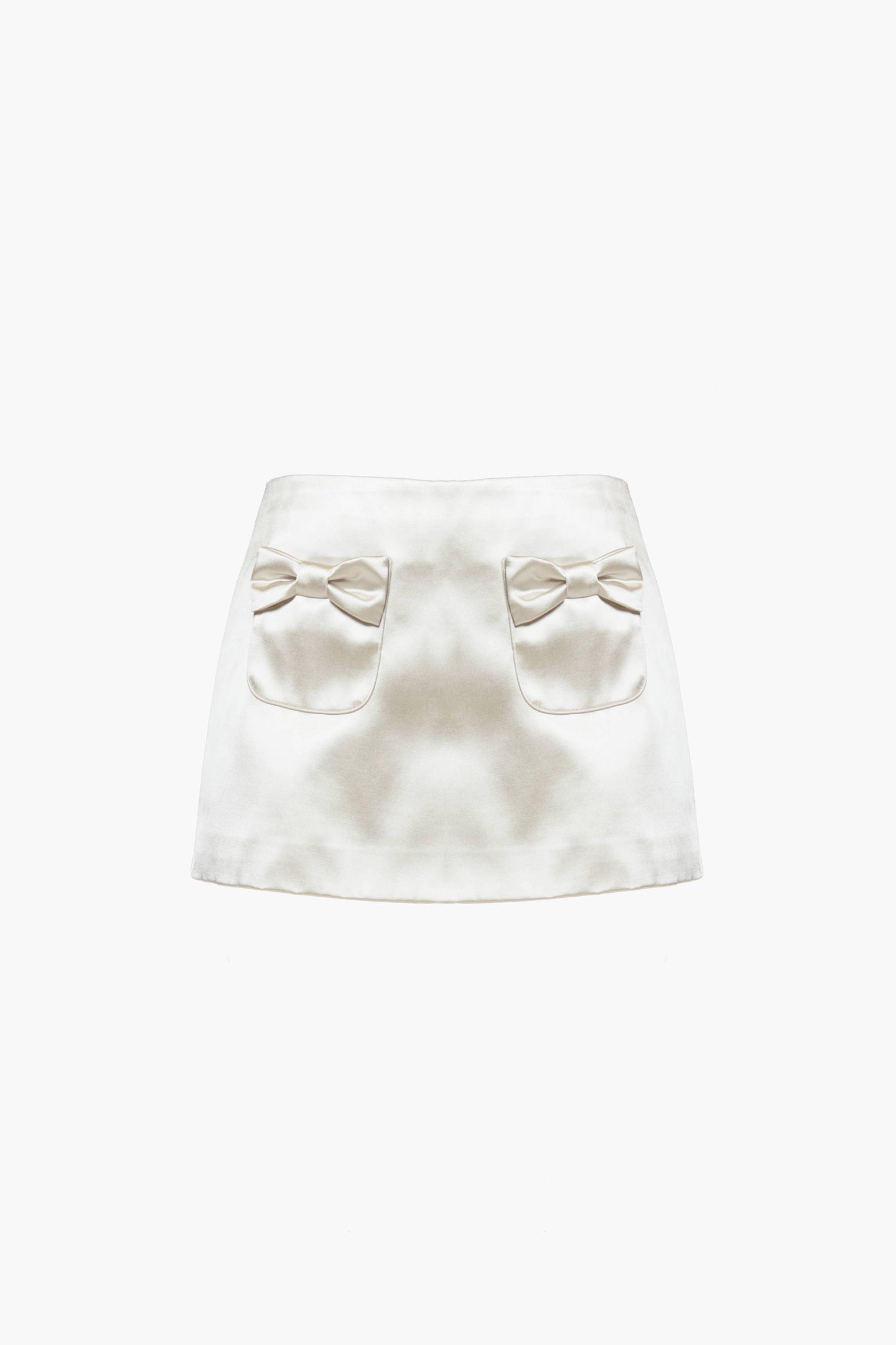Mini skirt in a heavyweight Champagne Satin Concealed zipper at back Features bow pockets at hips Made in NYC