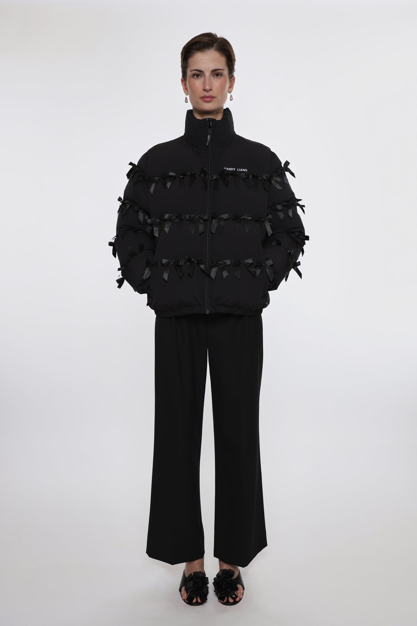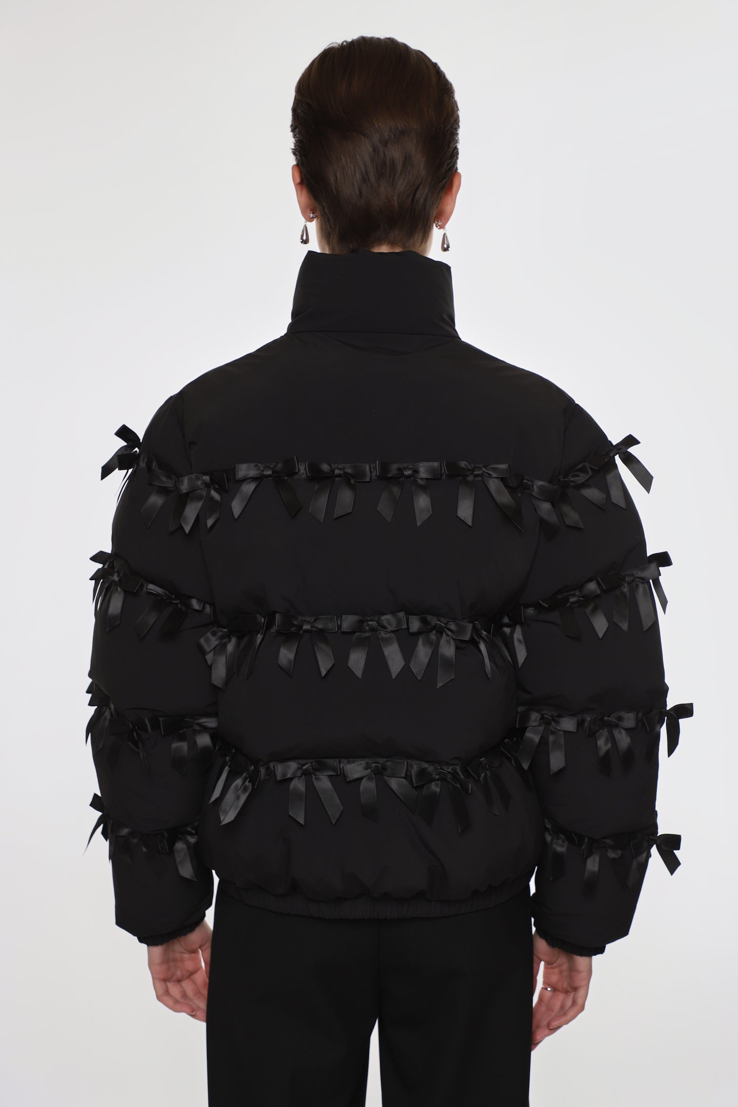 Black puffer jacket Ribbon and bow trim details throughoutZip closure at front Fleece lined exterior and interior pockets