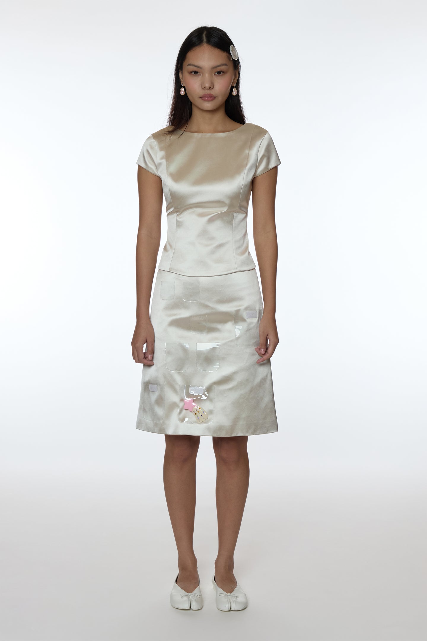 Champagne heavy satin fitted top Flattering straight neckline with cap sleeves Scooped at back with a concealed zipper Fully linedMade in NYC