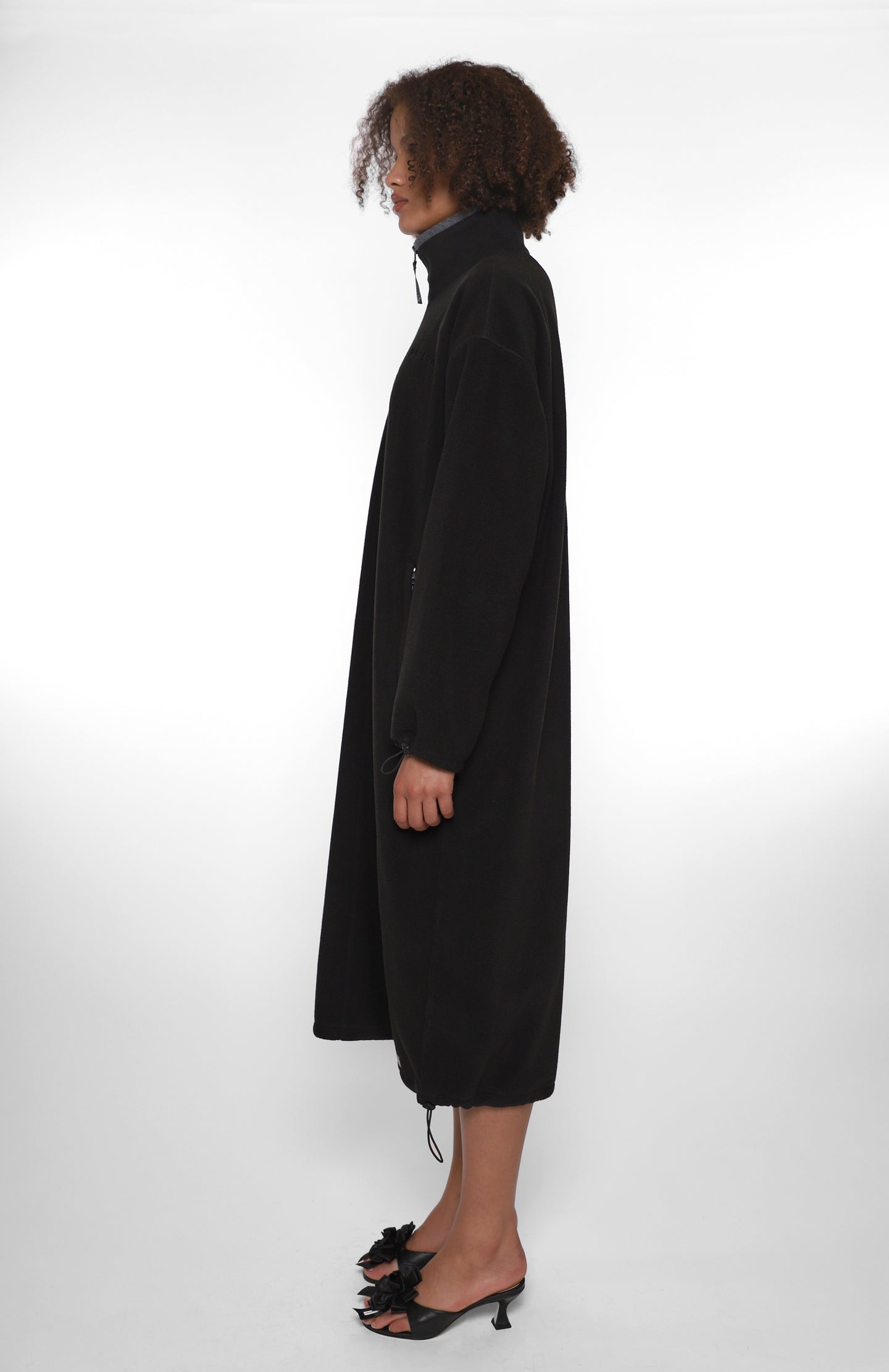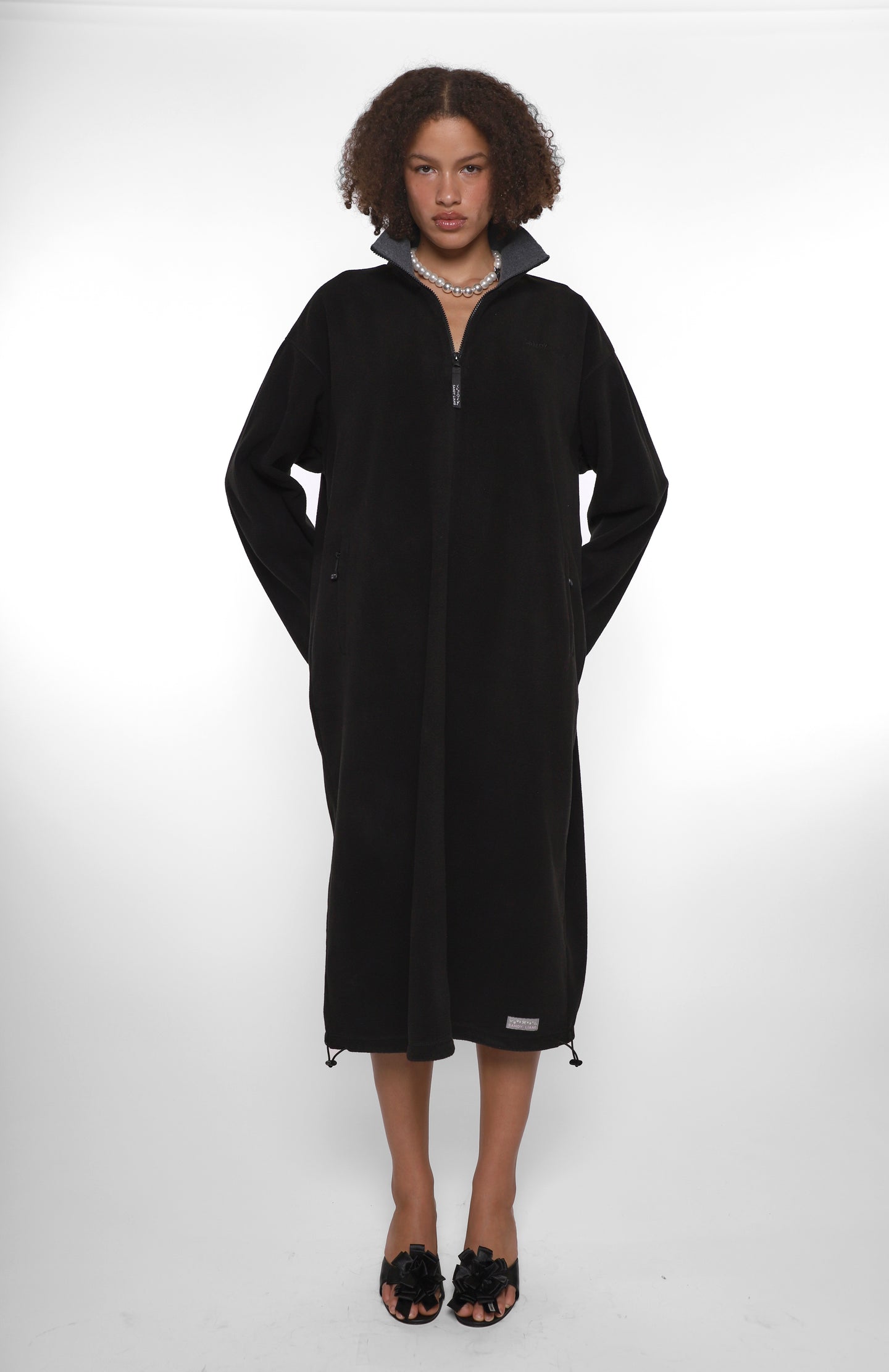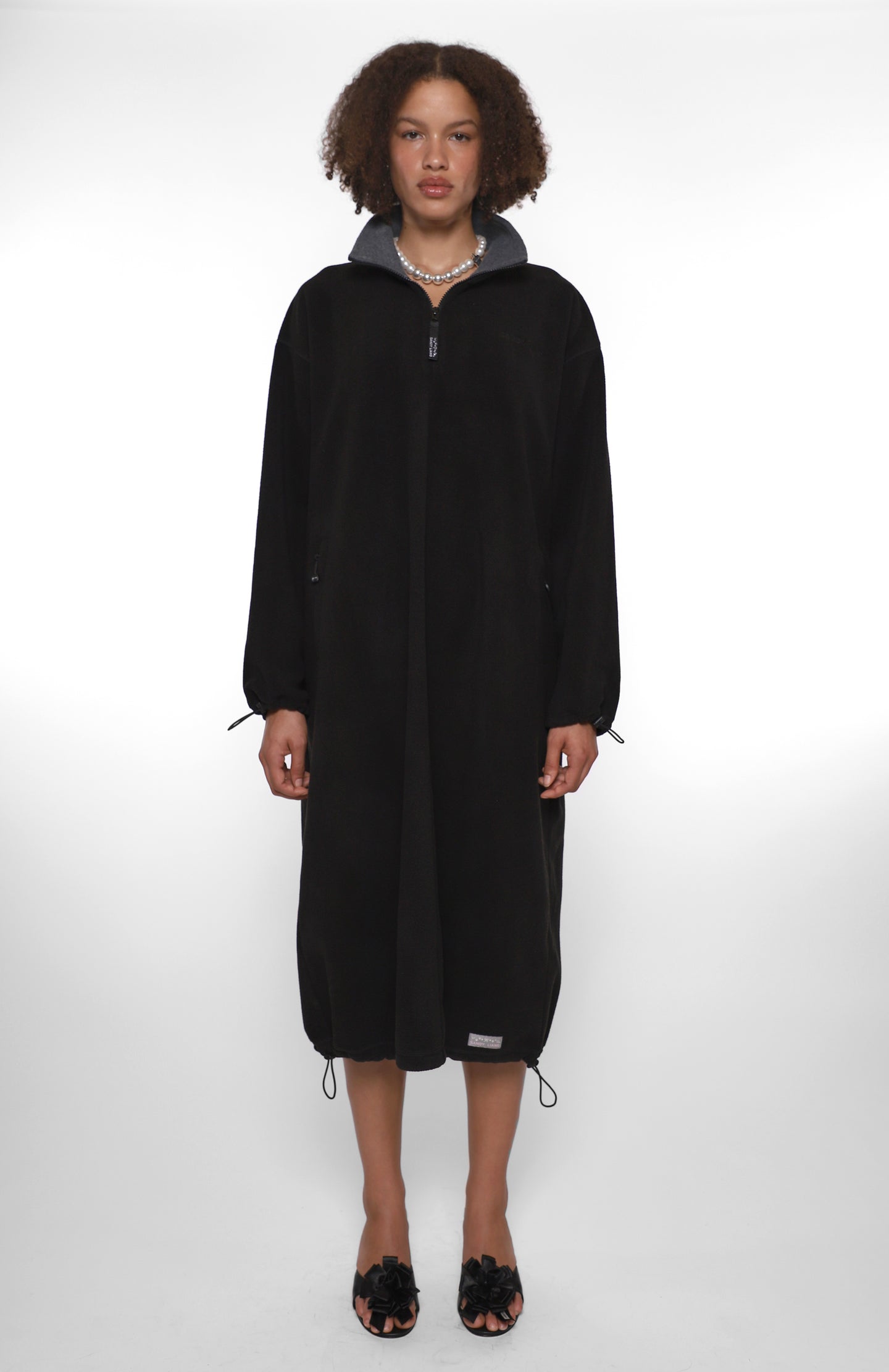 Oversized full length Black polar fleece dressElasticated drawcord details at sleeves and hem Zip pockets at sides Contrast binding at neck Unisex relaxed fit