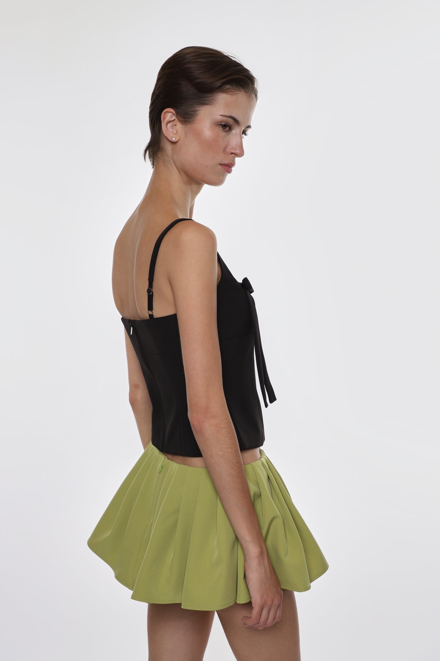 Mini skort in Chartreuse sponge suitingFeatures built in bloomersZipper ay backMade in NYC